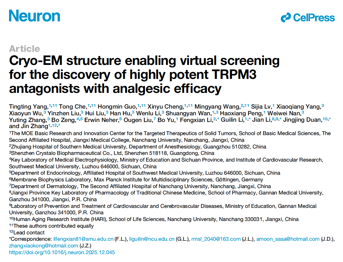 Recently, a collaborative team from the School of Basic Medical Sciences, the Second Affiliated Hospital, and the School of Life Sciences of Nanchang University, together with Shenzhen Jingdan Biomedical Technology Company, Gannan Medical University, and Zhujiang Hospital of Southern Medical University, published a research paper online in Neuron titled: "Cryo-EM Structure enabling virtual screening for the discovery of highly potent TRPM3 antagonists with analgesic efficacy."The research team first resolved the high-resolution cryo-electron microscopy (cryo-EM) structure of human TRPM3. They identified a small-molecule binding pocket within its voltage-sensor-like domain (VSLD). By combining large-scale virtual screening with structural optimization, the team developed TRPM3 antagonists with inhibitory activity reaching the picomolar level.This molecule demonstrated significant dose-dependent analgesic effects in various neuropathic pain and migraine animal models,without affecting motor function, demonstrating good efficacy and safety.