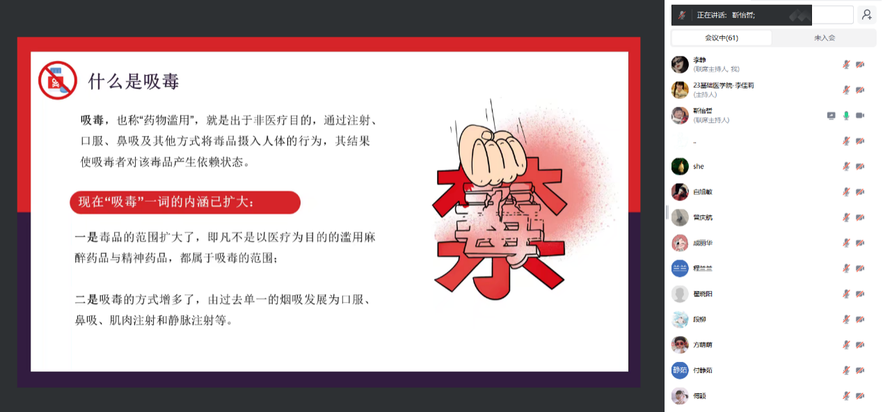 为深入学习贯彻习近平总书记关于禁毒工作重要指示精神,进一步增强在校学生识毒、防毒、拒毒意识和能力,培养学生树立“珍爱生命、远离毒品”、“健康人生、绿色无毒”的意识,11月24日,基础医学院研究生开展“毒品预防教育”主题班会,本次主题班会由2024级硕士1班班长靳怡哲同学主持,2024级硕士1班全体同学参加。