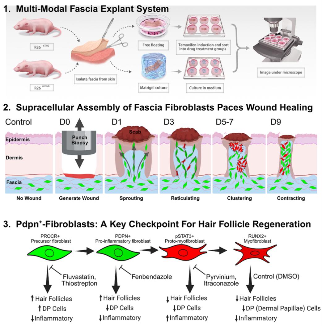 筋膜是位于皮肤下方的结缔组织层,是损伤响应中成纤维细胞前体细胞的重要来源。然而,深部组织成纤维细胞如何在组织水平上协调最佳伤口修复的机制仍不清楚。研究人员建立了多模态筋膜外植体培养系统,结合谱系特异性报告小鼠,通过活体成像技术追踪伤口成纤维细胞长达5天,发现筋膜成纤维细胞在愈合过程中形成三种时空有序的超细胞组装模式:萌发(sprouting)→网状化(reticulating)→聚集(clustering)。利用Prestwick化合物库进行高通量药物筛选,研究团队发现:成纤维细胞的组织模式比传统的细胞外基质沉积标志物更能预测伤口愈合结果;鉴定出两类治疗化合物:阻断网状化/聚集的化合物可抑制瘢痕形成;阻断早期萌发的化合物(氟伐他汀、硫链丝菌素、芬苯达唑)可阻止促炎性成纤维细胞/肌成纤维细胞分化,促进血管新生,减少炎症浸润;三种药物处理可实现无瘢痕再生性愈合,并伴随毛囊再生。